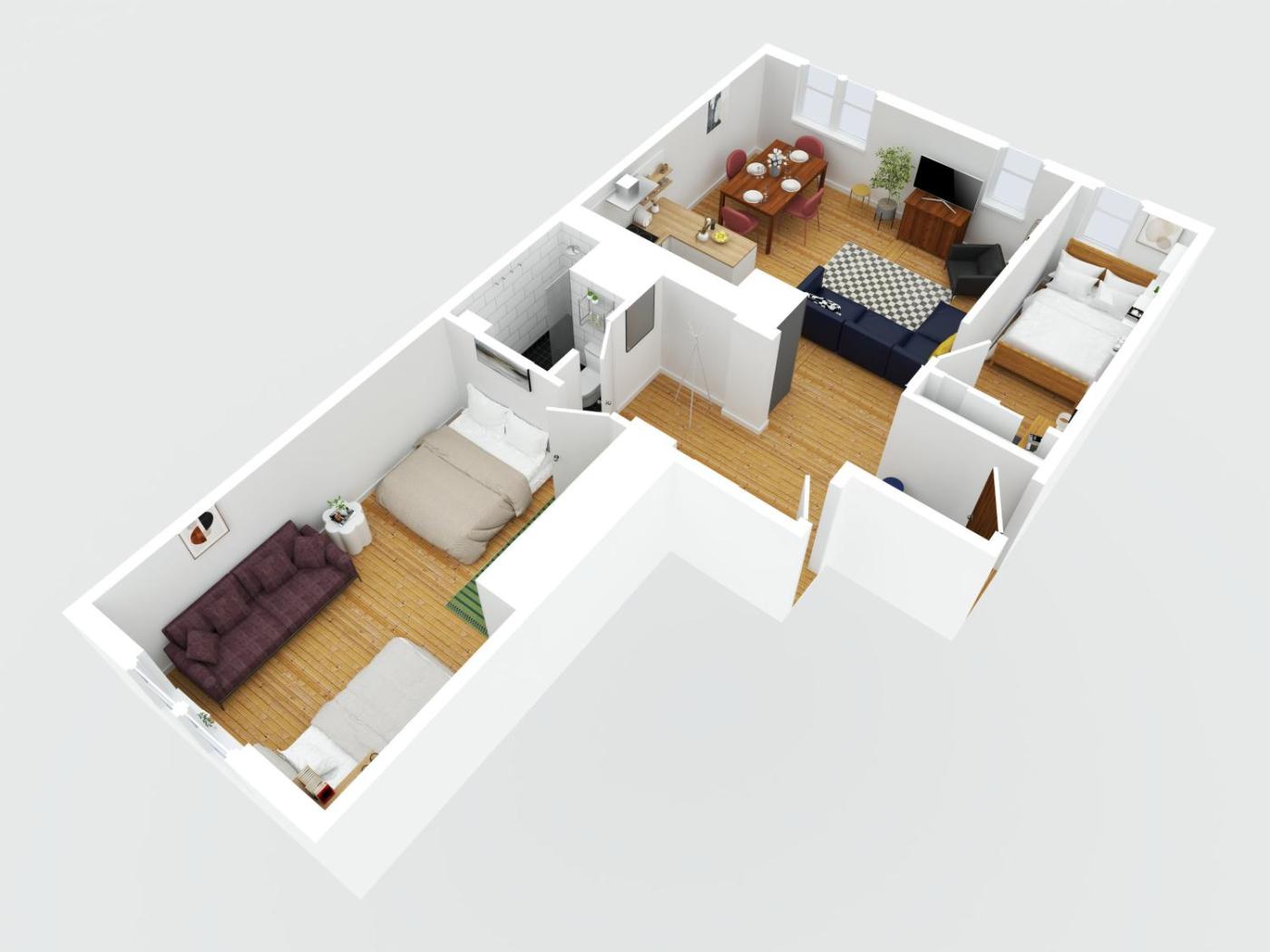 Two-Bedroom Apartment. This spacious apartment features 1 living room, 1 separate bedroom and 1 bathroom with a shower and free toiletries. The fully equipped kitchen has a stovetop, a refrigerator, a dishwasher and kitchenware. The apartment features a flat-screen TV with streaming services, a washing machine, a tea and coffee maker, a dining area as well as ancourtyard view. The unit has 2 beds.