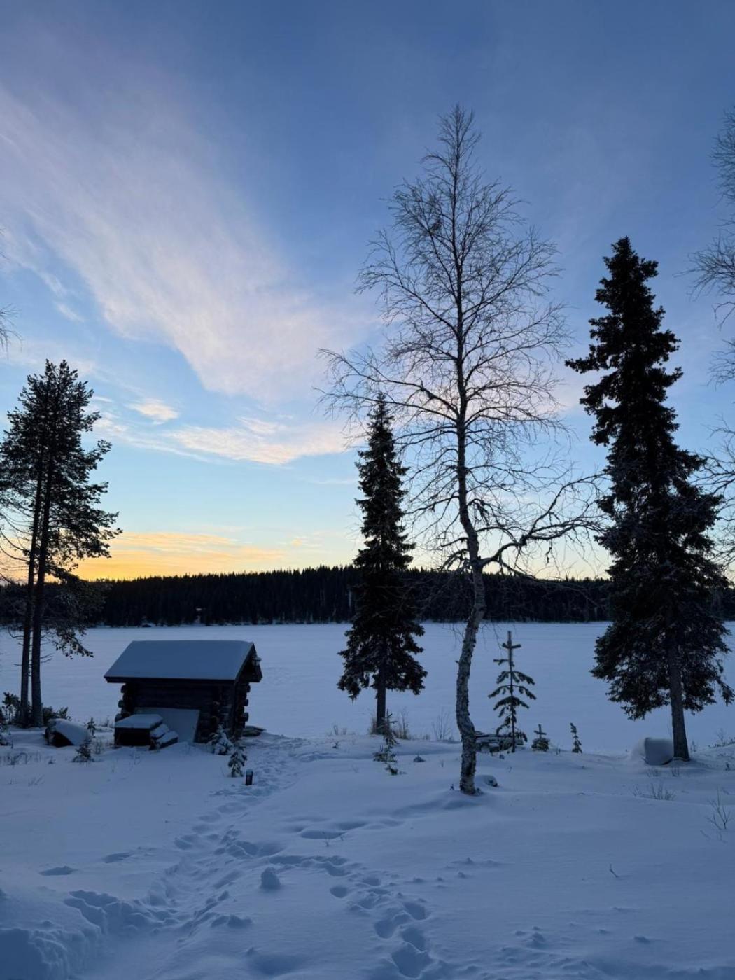 Kuonti-Ruka, kelohirsimökki järven rannalla