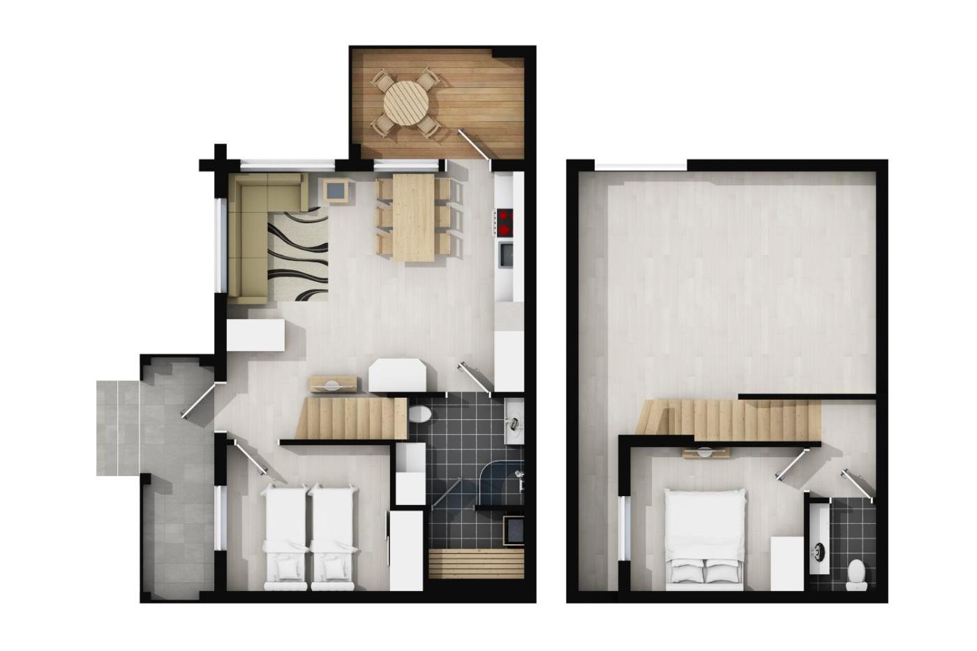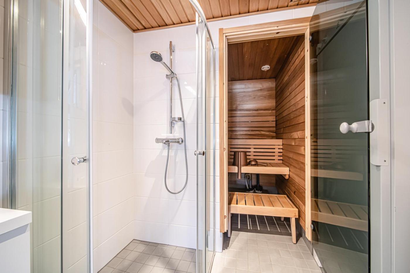Two-Bedroom Apartment. The sauna and fireplace are the standout features of this apartment. The apartment features a wardrobe, tumble dryer, as well as a shared bathroom boasting a shower. Guests can make meals in the kitchen that features a refrigerator, a dishwasher, an oven and a microwave. This apartment has a washing machine, a tea and coffee maker, a flat-screen TV and a terrace. The unit has 3 beds.