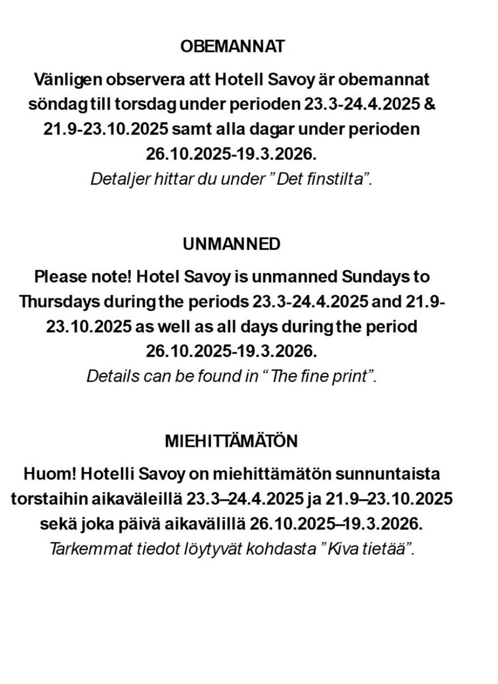 Hotel Savoy is unmanneddays during the period 26.10.2025-19.3.2026 as well as Sundays to Thursdays during 21.9.2025-23.10.2025 and 22.3.2026-23.4.2026. When the hotel is unmanned, check-in and breakfast will take place at hotel Pommern (ca. 100 meters from Hotel Savoy in Norragatan 10, Mariehamn). In hotel Pommern restaurant Kvarter5 as well as other services, such as sauna, are available for hotel Savoy’s guests, in accordance with current opening hours.Please inform in advance of your expected arrival time. You can use the Special Requests box when booking, or contact the property directly with the contact details provided in your confirmation.