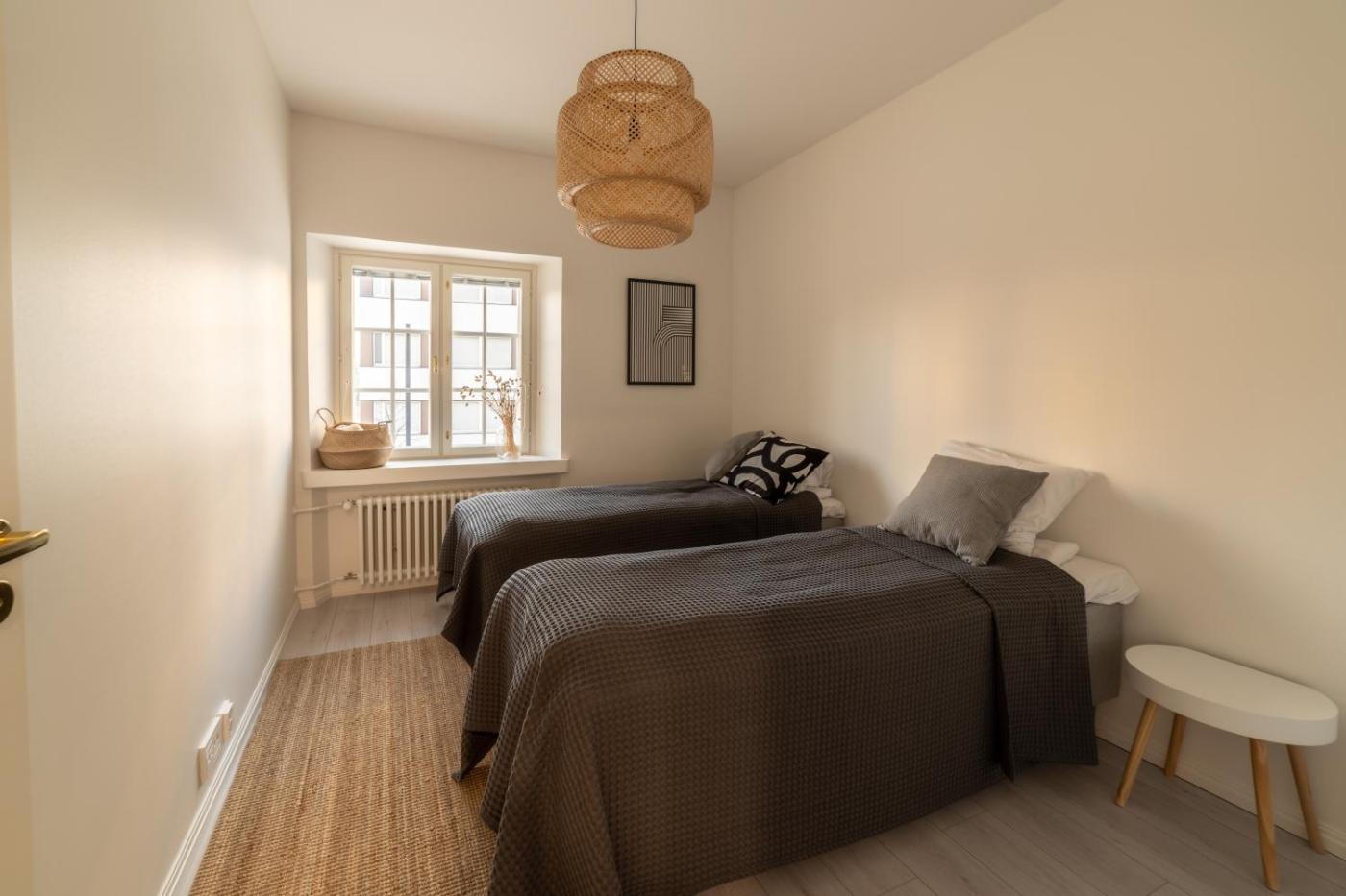 Two-Bedroom Apartment. This apartment provides a sauna. This spacious apartment comprises 1 living room, 2 separate bedrooms and 1 bathroom with a shower and a bidet. In the well-fitted kitchen, guests will find a stovetop, a refrigerator, a dishwasher and kitchenware. The apartment features parquet floors, a seating area with a flat-screen TV, a washing machine, a tea and coffee maker as well as city views. The unit offers 4 beds.
