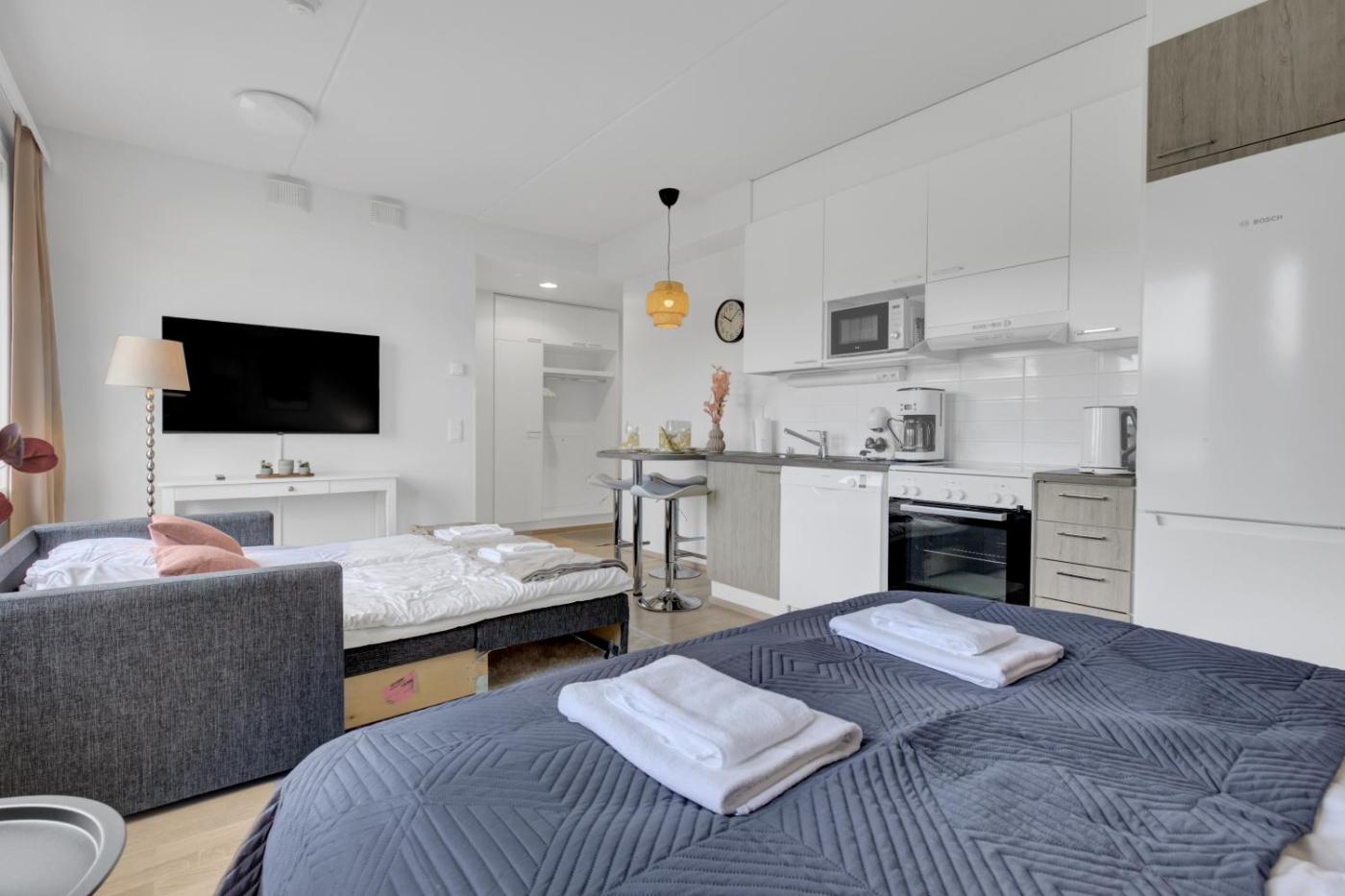 Studio Apartment. This apartment features a kitchen, a seating area, 1 separate bedroom and 1 bathroom with a shower and a bidet. In the well-equipped kitchen, guests will find a stovetop, a refrigerator, a dishwasher and kitchenware. The apartment features a washing machine, soundproof walls, a tea and coffee maker, a flat-screen TV, as well as city views. The unit has 2 beds.