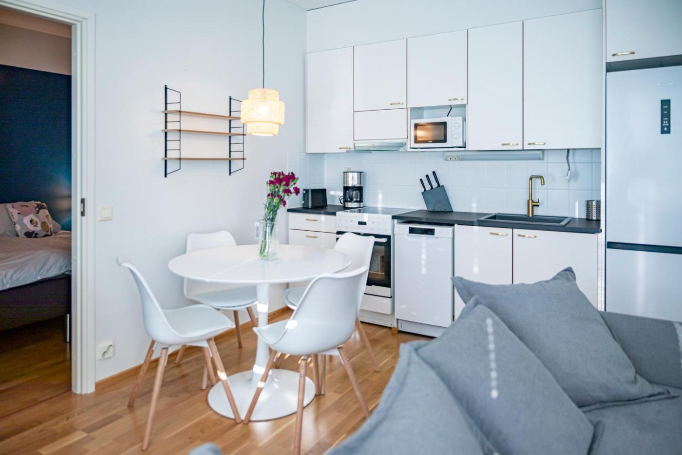 One-Bedroom Apartment with Balcony. Guests will have a special experience as this apartment offers a sauna. Featuring a private entrance, this apartment comprises 1 living room, 1 separate bedroom and 1 bathroom with a walk-in shower and a hairdryer. The well-equipped kitchen features a stovetop, a refrigerator, a dishwasher and kitchenware. Boasting a terrace with city views, this apartment also provides a washing machine and a flat-screen TV. The unit offers 2 beds and 1 futon.