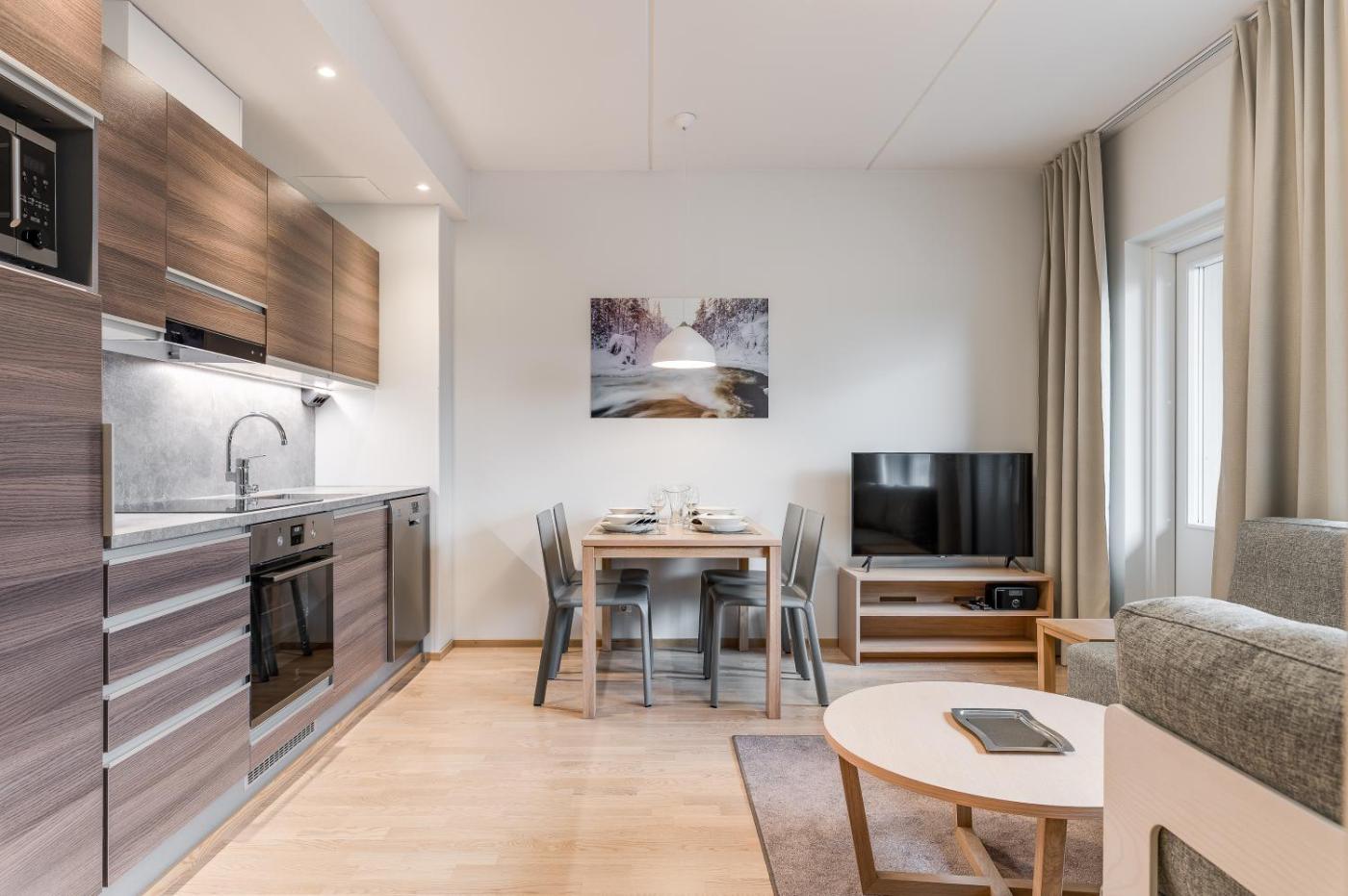 Two-Bedroom Apartment. The sauna is a top feature of this apartment. This apartment comes with 1 living room, 2 separate bedrooms and 1 bathroom with a walk-in shower and a bidet. In the kitchen, guests will find a stovetop, a refrigerator, a dishwasher and kitchenware. The apartment has parquet floors, a seating area with a flat-screen TV, a washing machine, soundproof walls, as well as a tea and coffee maker. The unit has 4 beds.