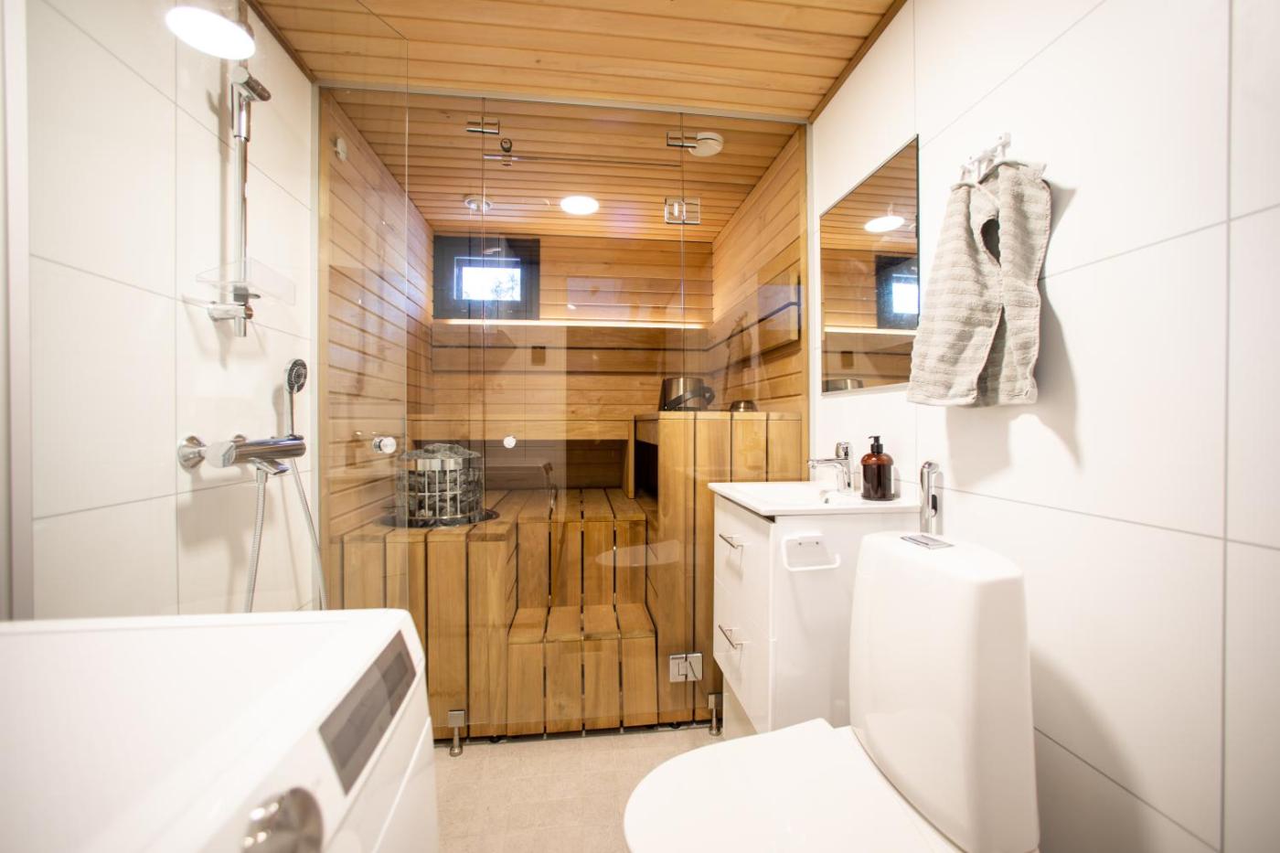 Two-Bedroom Villa. This villas standout features are the hot tub, sauna and fireplace. In the fully equipped kitchen, guests will find a stovetop, a refrigerator, a dishwasher and kitchenware. This air-conditioned villa comprises a dining area, a flat-screen TV with cable channels a washing machine and a terrace. The unit offers 5 beds.